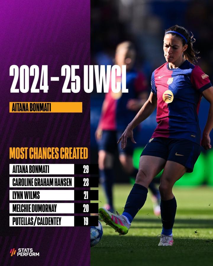 顶级创造力!邦马蒂本赛季女足欧冠中创造最多机会+最多助攻