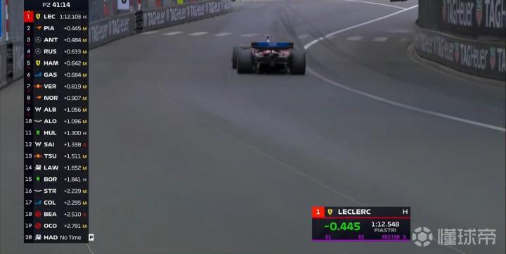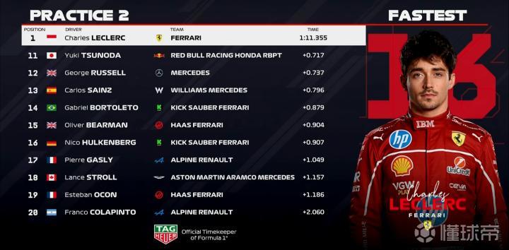 二练进行至19分钟,勒克莱尔使用硬胎完成飞驰,三段刷紫来到榜首;