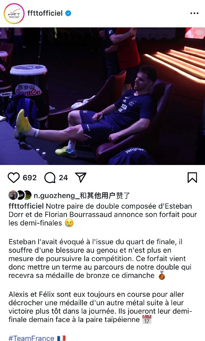 法国乒协发文:我们的双打组合多尔/布尔拉萨德宣布退出半决赛,多尔在四分之一决赛后膝盖受伤,无法继续比赛。因此,这个组合结束了他们的双打之旅,他们将在周日获得铜牌。