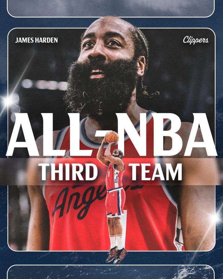 哈登时隔五年重返最佳阵,生涯八次入选6次一阵2次三阵