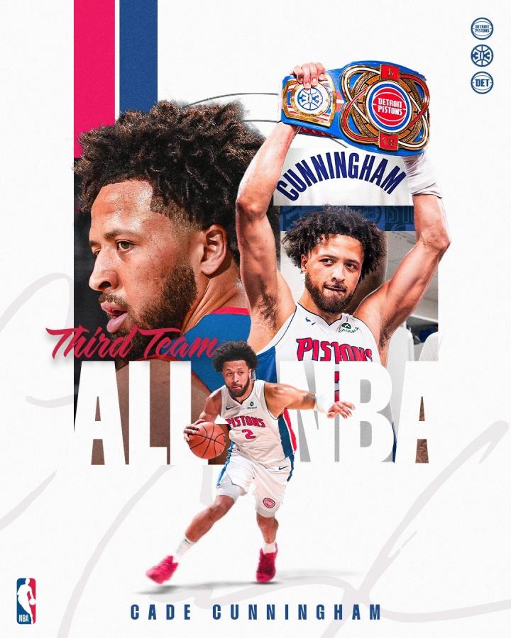 北京时间今日,NBA官方公布了本赛季常规赛最佳阵容,活塞队当家球星凯德-坎宁安入选了三阵。