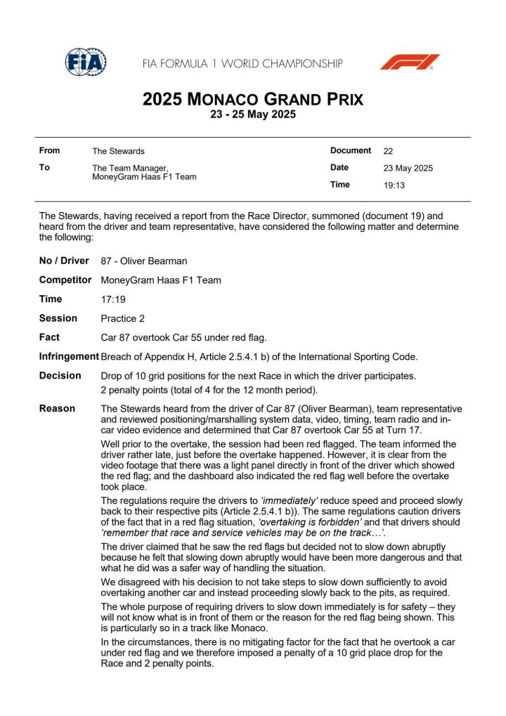 北京时间5月24日,FIA在F1摩纳哥大奖赛的首日练习赛结束后,开出两张罚单。哈斯车手贝尔曼因红旗下超车,正赛罚退10位起步,超级驾照罚2分。阿斯顿马丁车手斯特罗尔则因刹车区变线导致勒克莱尔追尾,正赛罚退1位起步,超级驾照罚1分.