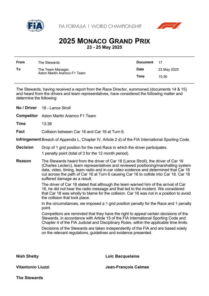 判罚解读:赛会干事组审查了车载定位/调度系统数据、视频、计时、车队无线电及车载录像等证据,确认斯特罗尔在6号弯变线切入勒克莱尔的行驶路线,导致碰撞发生,勒克莱尔的赛车因此受损。斯特罗尔陈述称,虽然车队曾提醒其注意勒克莱尔接近,但他未听到无线电信息。赛事干事组认定:碰撞责任完全归咎于斯特罗尔,勒克莱尔在当时情况下无法避免事故。因此,斯特罗尔正赛罚退1位起步,超级驾照扣1分。