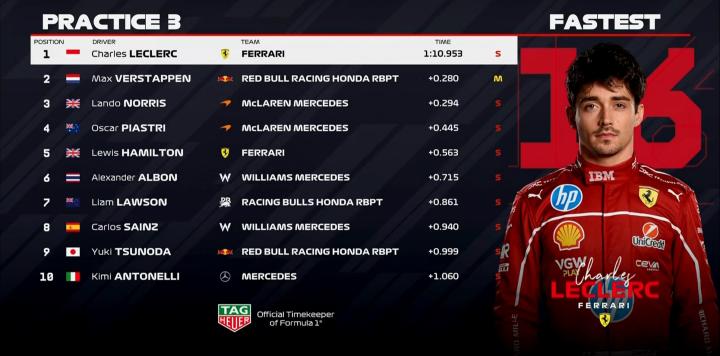 第1-第5:勒克莱尔、维斯塔潘、诺里斯、皮亚斯特里、汉密尔顿