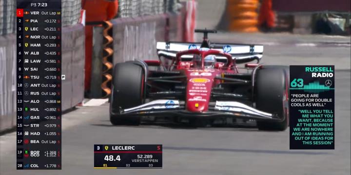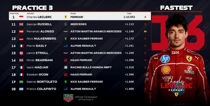 三练进行至50分钟,汉密尔顿上到第4,勒克莱尔仍保持在第2,从多位车手的成绩来看,C6软胎在第三计时段的表现较为挣扎,不少车手都在此计时段刷黄!