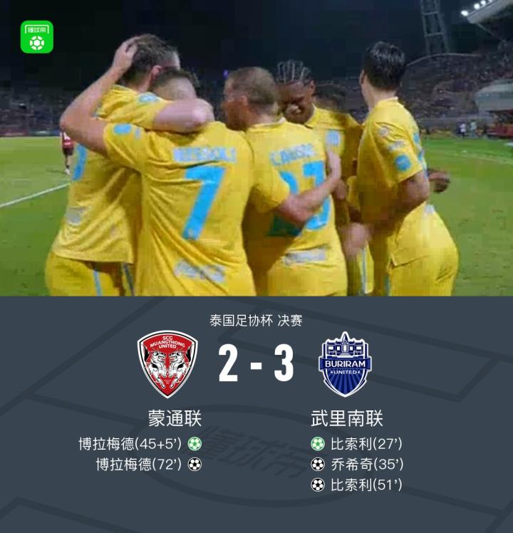泰国足协杯决赛,蒙通联与武里南联展开较量。上半场蒙通联禁区内手球送点,比索利主罚命中,之后乔希奇门前两连击破门扩大比分,之后乔希奇手球送点,博拉梅德主罚命中扳回一球。下半场比索利混战破门完成双响,之后帕拉切特直塞,博拉梅德破门完成双响。最终武里南联3-2蒙通联夺泰国杯冠军。