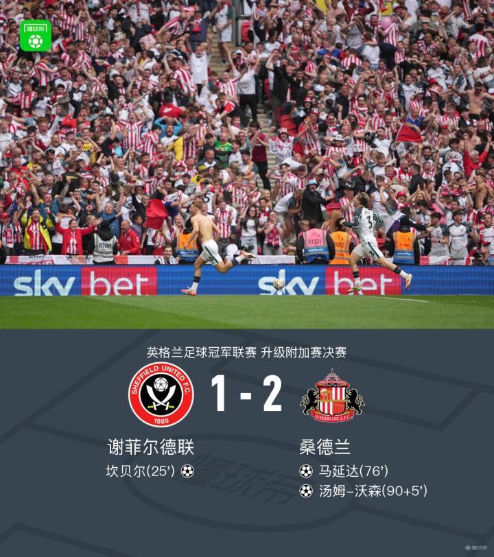 北京时间5月24日,英格兰足球冠军联赛升级附加赛决赛,谢菲尔德联主场迎战桑德兰。上半场,坎贝尔攻入一球取得领先。索萨干扰门将,罗伯斯的进球被吹无效。下半场,马延达接队友助攻将比分扳平。补时阶段,汤姆-沃森为桑德兰再入一球完成反超。最终,桑德兰2-1逆转谢菲联,成功升入英超。