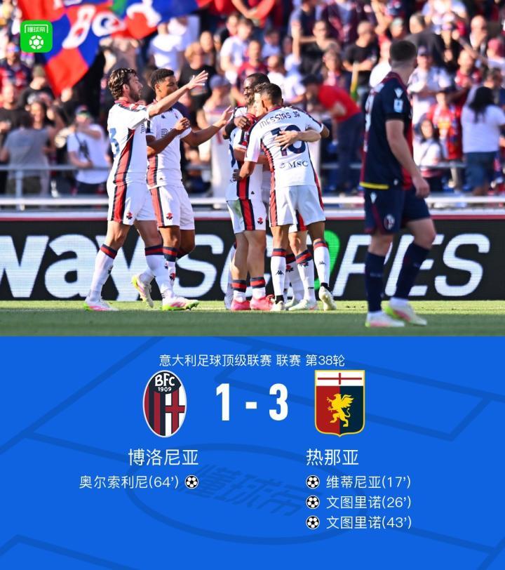 北京时间5月25日意大利足球顶级联赛 联赛 第38轮,博洛尼亚主场对阵热那亚。博洛尼亚奥尔索利尼破门。热那亚维蒂尼亚破门,文图里诺梅开二度。最终比分博洛尼亚 1-3 热那亚。