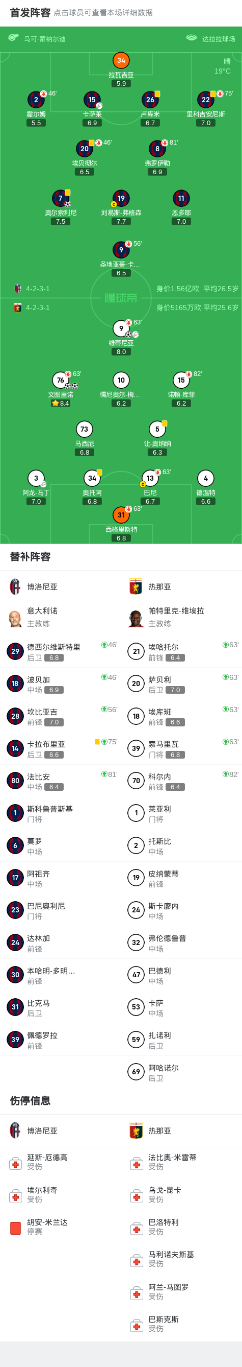 热那亚3-1博洛尼亚收官,文图里诺梅开二度,维蒂尼亚传射