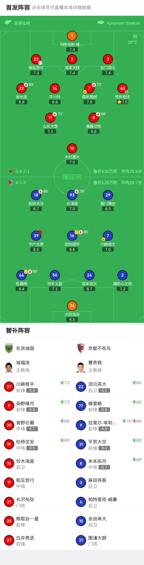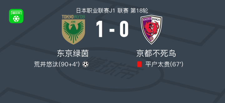 日本职业联赛J1联赛第18轮,东京绿茵主场迎战京都不死鸟。比赛中,京都不死鸟的平户太贵被红牌罚下,少一人作战的局面对球队影响较大。补时阶段,东京绿茵由纲岛悠斗送出助攻,荒井悠汰打入制胜球。最终,东京绿茵1-0战胜京都不死鸟。