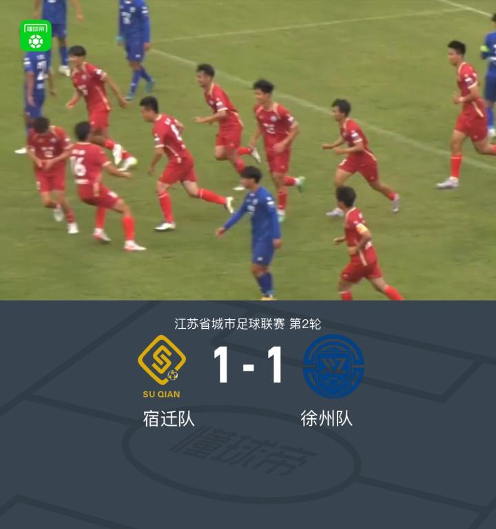 江苏城市联赛:徐州队客场补时绝平1-1宿迁队,双方各拿一分战报bot @懂球帝2025-05-25 18:00北京时间5月25日江苏省城市足球联赛第2轮,宿迁队主场对阵徐州队。最终比分宿迁队1-1战平徐州队,双方各拿一分。点击查看本场比赛详细数据>>点击查看江苏城市联赛完整积分榜>>精彩瞬间开场闪击,宿迁队率先得分,1-0领先徐州队伤停补时阶段,徐州队利用角球机会扳平比分,徐州队1-1宿迁队展开更多