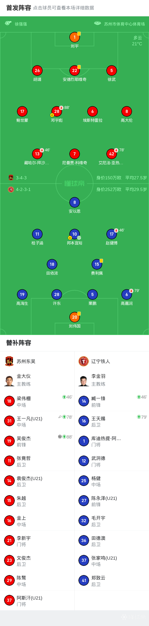 北京时间5月25日,中国足球甲级联赛第10轮,苏州东吴主场对阵辽宁铁人。此役,安以恩造点,邦本宜裕点射打破僵局,替补登场的吴俊杰补时绝平救主。最终,苏州东吴1-1战平辽宁铁人。