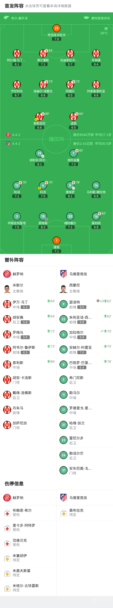 马竞4-0客胜赫罗纳,瑟洛特帽子戏法,朗格莱破门