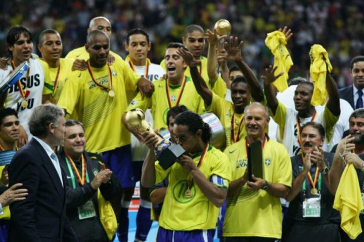2005年夏天,卡洛斯·佩雷拉率领巴西队出征联合会杯,因为卡福和罗伯托·卡洛斯均得到休息的机会,罗纳尔迪尼奥带上了队长袖标。半决赛迎战德国队,小罗打进1粒点球,助“桑巴军团”以3:2获胜。在决赛中,巴西队则以4:1大胜老对手阿根廷队,小罗、卡卡和阿德里亚诺都有进球入账。