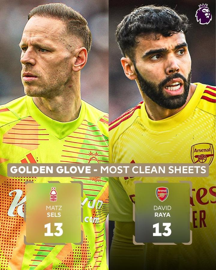 2024-25赛季英超收官战,在诺丁汉森林和阿森纳先后丢球后,诺丁汉森林门将泽尔斯和阿森纳门将戴维-拉亚确定分享本赛季英超金手套。
