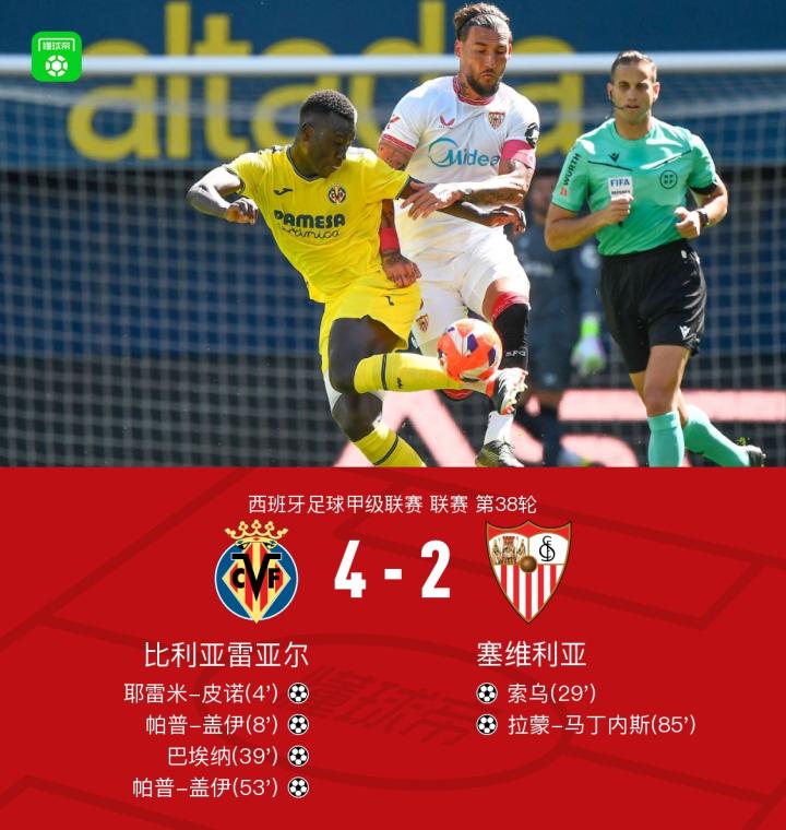 北京时间5月25日,西班牙足球甲级联赛第38轮,比利亚雷亚尔主场迎战塞维利亚。比赛中,比利亚雷亚尔率先由耶雷米-皮诺攻入一球取得领先,随后帕普-盖伊两次建功完成梅开二度,巴埃纳也有一球入账。塞维利亚方面,索乌和拉蒙-马丁内斯分别打入一球为球队追回比分。最终,比利亚雷亚尔以4-2战胜塞维利亚。