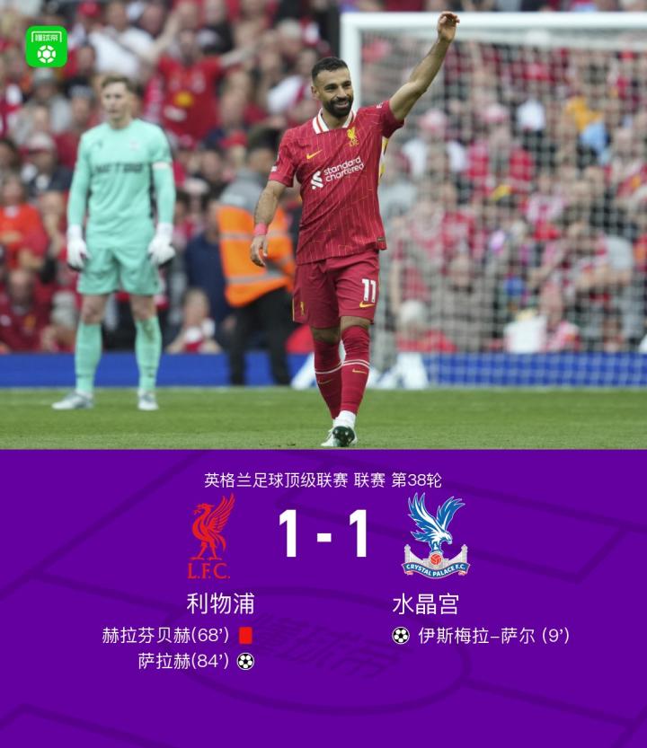 北京时间5月25日23:00,英超第38轮收官战,联赛冠军利物浦主场迎战足总杯冠军水晶宫。上半场,水晶宫通过一次精妙配合,由伊斯梅拉-萨尔完成破门,随后马特塔进球被吹+击中横梁,迪亚斯屡次制造威胁射门;下半场,阿诺德替补登场迎来红军生涯告别战,赫拉芬贝赫放倒镰田大地吃到红牌,随后若塔射门中柱,萨拉赫凌空破门扳平比分。最终,利物浦主场1-1战平水晶宫,完成赛季之旅。