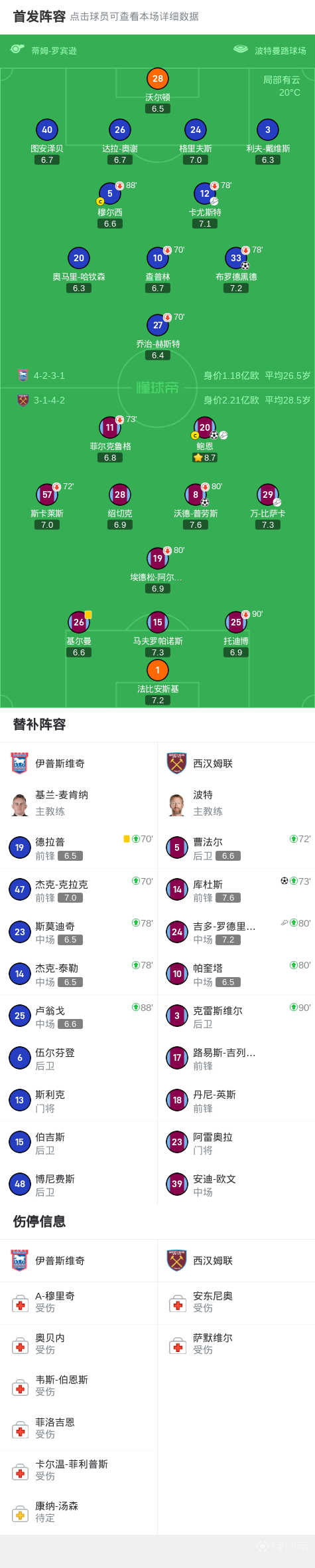 北京时间5月25日英格兰足球顶级联赛 联赛 第38轮,伊普斯维奇主场对阵西汉姆联。伊普斯维奇布罗德黑德破门。西汉姆联沃德-普劳斯破门,鲍恩破门,库杜斯破门。最终比分伊普斯维奇 1-3 西汉姆联。