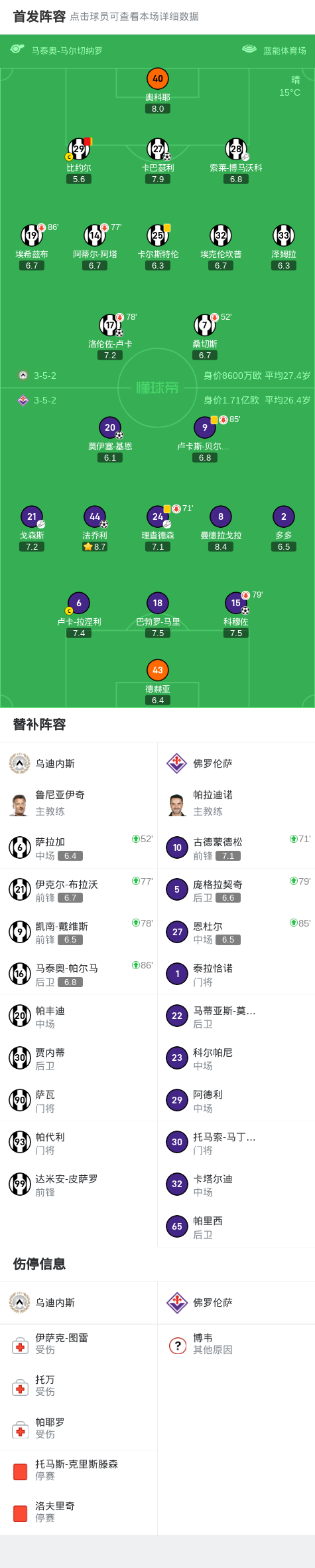 在北京时间5月26日进行的意大利足球甲级联赛第38轮比赛中,乌迪内斯主场迎战佛罗伦萨。比赛开始后,乌迪内斯凭借洛伦佐-卢卡的进球取得领先。随后,乌迪内斯因场上队员被罚下导致人数劣势。佛罗伦萨在下半场展开反击,法乔利为球队扳平比分,科穆佐随后帮助紫百合实现反超。尽管卡巴瑟利为乌迪内斯追回一球,但莫伊塞-基恩的进球最终确保佛罗伦萨以3-2获胜。