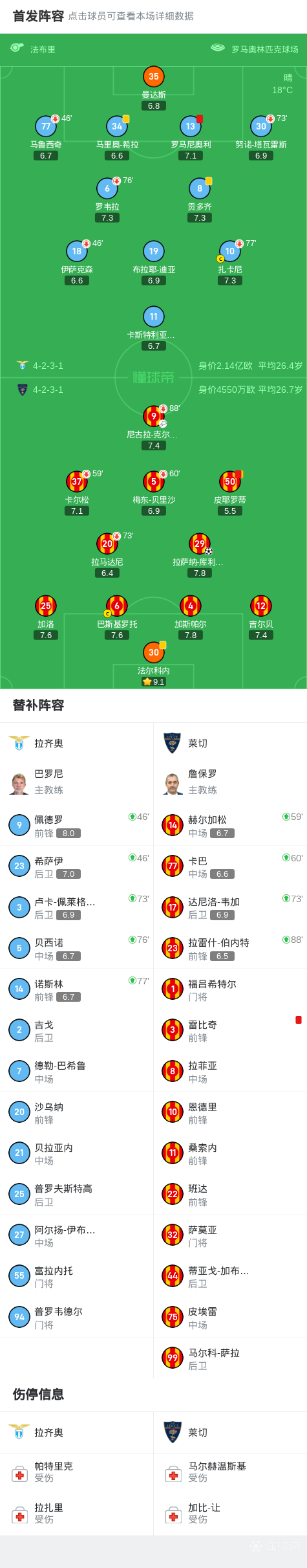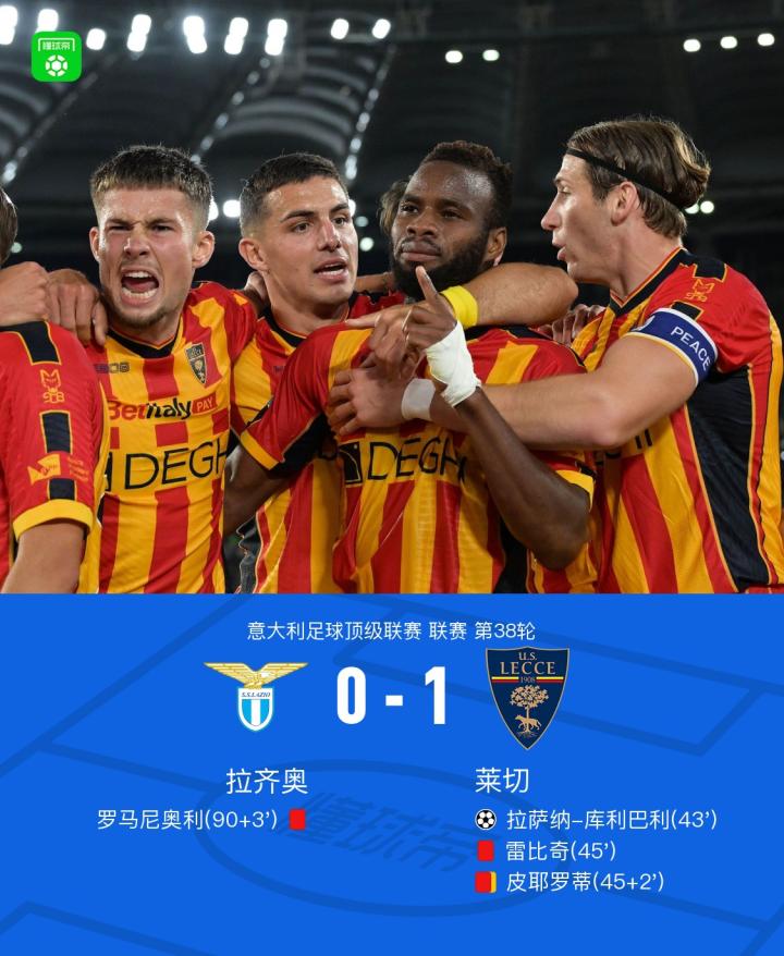 北京时间5月26日意大利足球顶级联赛 联赛 第38轮,拉齐奥主场对阵莱切。莱切拉萨纳-库利巴利破门。最终比分拉齐奥 0-1 莱切。