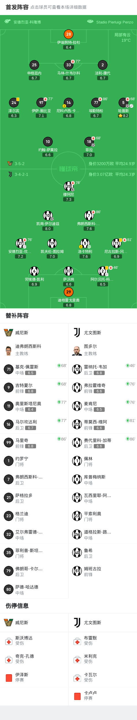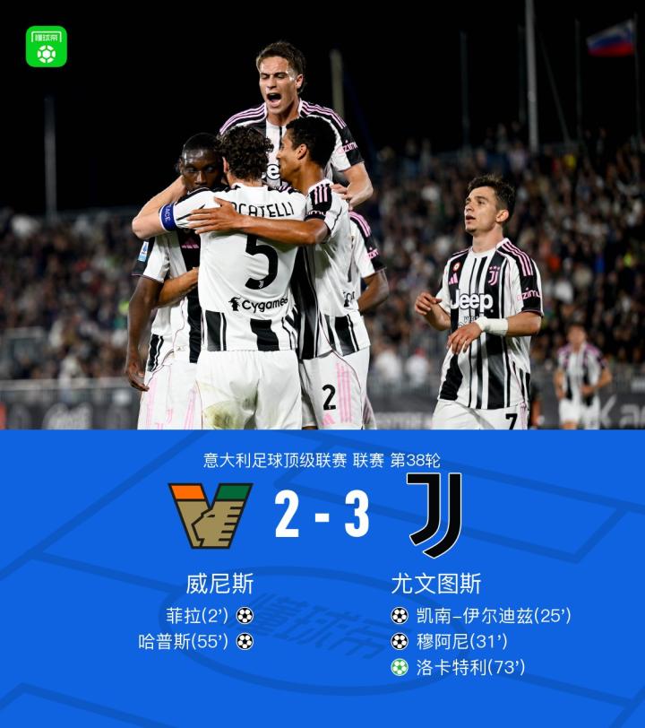 北京时间5月26日,意大利足球顶级联赛第38轮,威尼斯主场迎战尤文图斯。比赛刚开始,哈普斯送出助攻,菲拉破门完成闪击,阿尔贝托-科斯塔进攻手球在先,随后破门被吹无效,伊尔迪兹调整后小角度完成破门将比分扳平,随后穆阿尼禁区低射破门完成反超。下半场哈普斯跟进推射破门再度使两队回到同一起跑线,小孔塞桑禁区造点,洛卡特利操刀点射命中终结比赛。全场战罢,最终尤文3-2送威尼斯降级并进军欧冠。