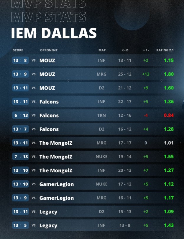 北京时间5月26日,CS2赛事IEM达拉斯站总决赛,VIT 3-0横扫MOUZ夺得冠军,队内狙击手ZywOo以1.27的Rating斩获赛事HLTV&ESL双料MVP。