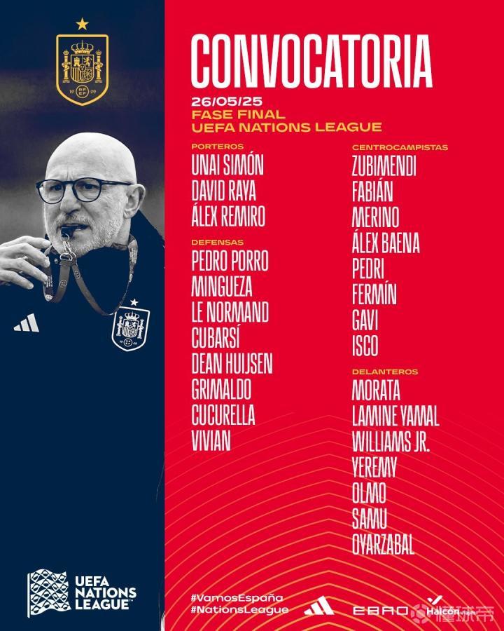 西班牙欧国联大名单:亚马尔领衔,佩德里、莫拉塔在列