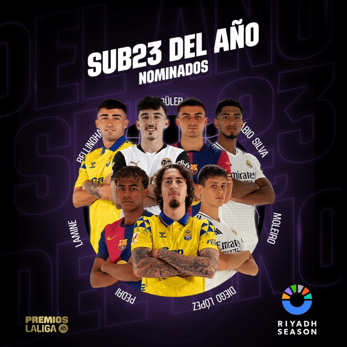 本赛季西甲最佳U23球员候选:亚马尔、佩德里在列;贝林、居莱尔入选能干利艾 @懂球帝2025-05-27 00:43北京时间5月26日凌晨,2024-2025赛季西班牙足球甲级联赛正式落下帷幕,巴塞罗那成功夺得本赛季西甲冠军。西甲官方也评选出本赛季西甲最佳U23球员的候选名单。具体名单如下亚马尔(巴塞罗那)佩德里(巴塞罗那)贝林厄姆(皇家马德里)居莱尔(皇家马德里)法比奥-席尔瓦(拉斯帕尔马斯)莫莱罗(拉斯帕尔马斯)迭戈-洛佩斯(瓦伦西亚)展开更多
