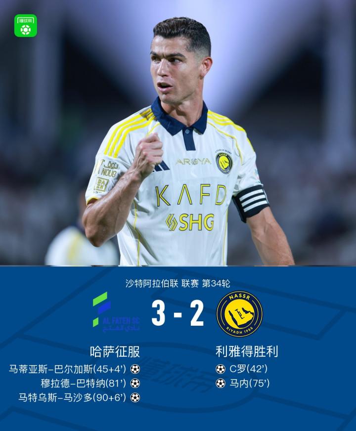 利雅得胜利遭逆转2-3哈萨征服,C罗、马内破门,马沙多绝杀