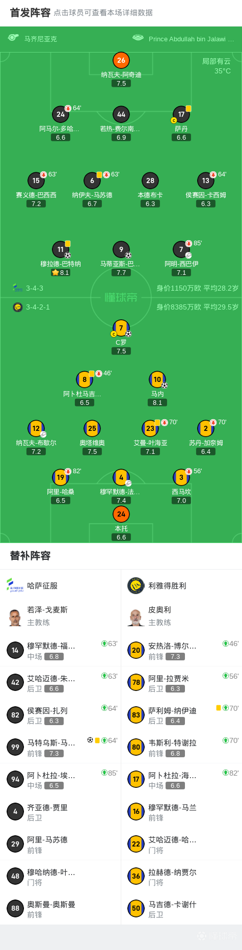 沙特阿拉伯联赛第34轮,哈萨征服主场迎战利雅得胜利。上半场,C罗接队友助攻完成破门,为利雅得胜利取得领先。随后,马蒂亚斯-巴尔加斯在进攻中抓住机会打入一球,帮助哈萨征服扳平比分。下半场,C罗策动进攻,布歇尔助攻马内破门再次超出比分。随后,巴特纳任意球直接破门,比分再次被扳平。补时阶段,马沙多破门杀死比赛。最终,哈萨征服3-2逆转利雅得胜利。