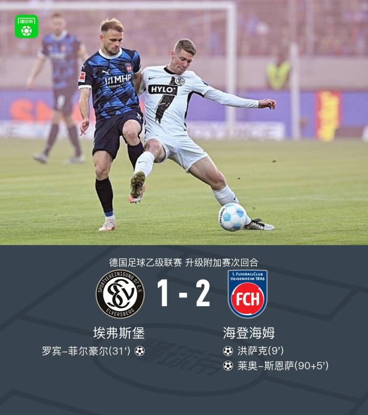 北京时间5月27日,德国足球乙级联赛升级附加赛次回合,埃弗斯堡主场迎战海登海姆。比赛中,海登海姆由洪萨克率先建功,助攻者是莱奥-斯恩萨。随后,埃弗斯堡凭借罗宾-菲尔豪尔的进球将比分扳平。比赛最后阶段,莱奥-斯恩萨再次挺身而出,完成关键进球帮助海登海姆再度领先。最终,埃弗斯堡1-2不敌海登海姆。两回合总比分埃弗斯堡3-4海登海姆,遗憾无缘晋级。