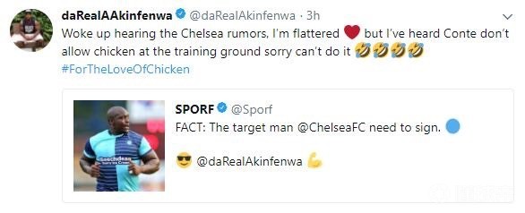 阿金芬瓦在推特上转发了一家名叫Sporf的媒体的新闻,声称他是蓝军需要的那个人。阿金芬瓦写道:“早上起来看到我要加盟切尔西的谣言…但我听说孔蒂不让在训练场上吃炸鸡,所以还是算了吧。#鸡肉是我的挚爱”