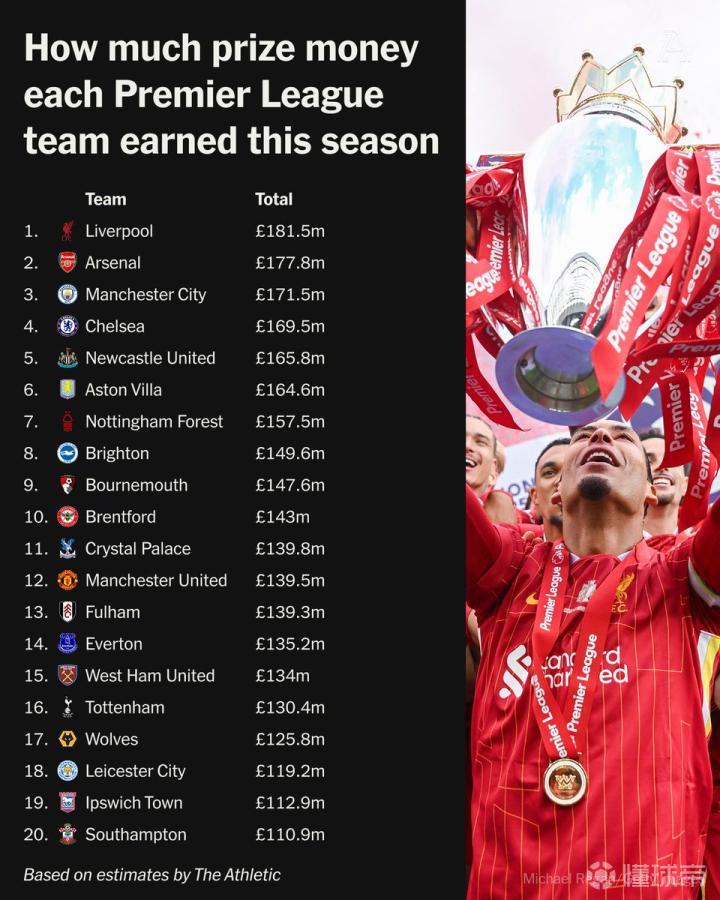 24-25赛季英超比赛在上周末结束,北京时间5月27日,The Athletic列出了他们估算的英超各队奖金收入情况。