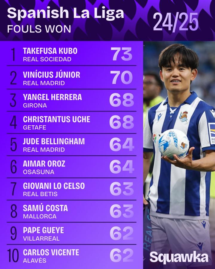 73次,久保建英是本赛季西甲被侵犯次数最多的球员
