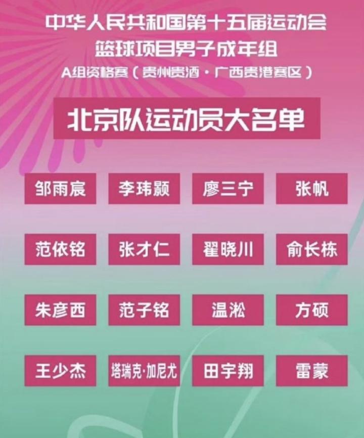 北京时间5月28日,北京队公布了第十五届全运会篮球项目男子成年组的16人大名单,效力于北京男篮的翟晓川、范子铭,效力于北控男篮的廖三宁、张帆在列。