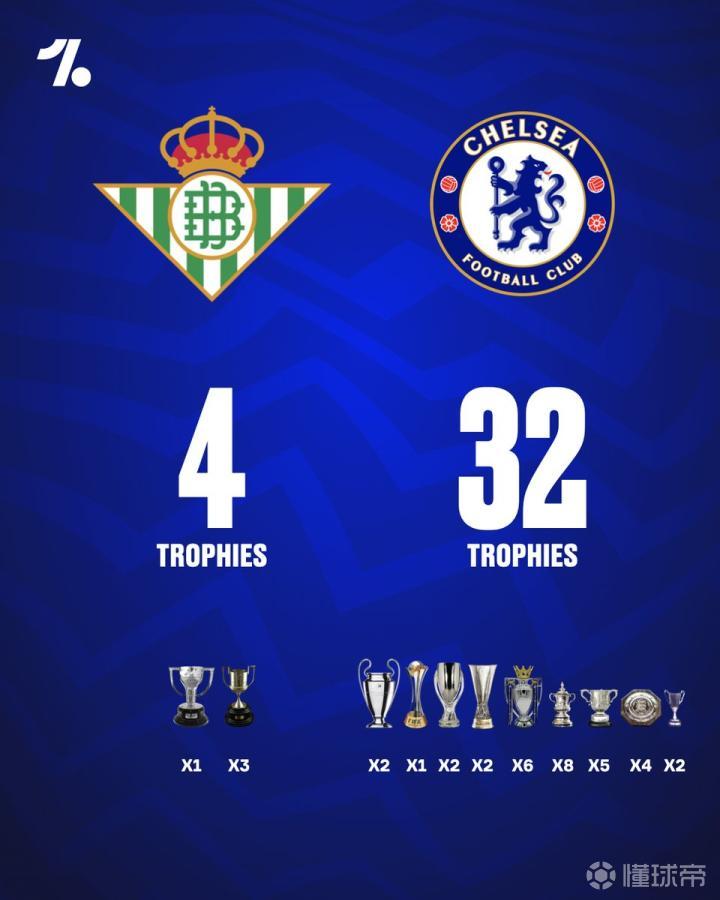 北京时间5月29日,皇家贝蒂斯和切尔西将在史拉斯科球场争夺本赛季欧协联冠军。在决赛开始前,足球媒体OneFootball在社媒上发布了两队历史荣誉数量的对比。
