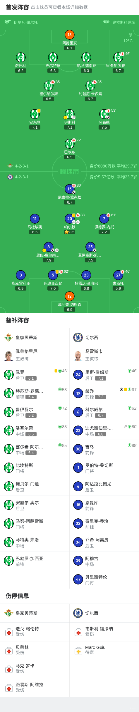 第8分钟,阿布德禁区左脚低射破门,贝蒂斯1-0领先切尔西