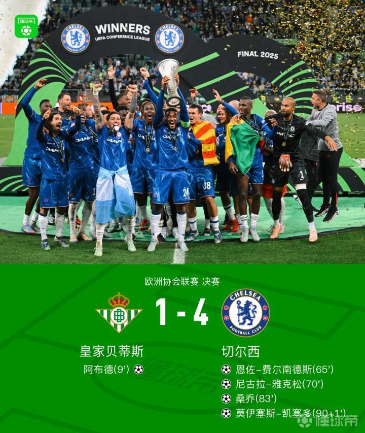 北京时间5月29日,欧洲协会联赛决赛在皇家贝蒂斯与切尔西之间展开。上半场阿布德破门,下半场帕尔默两助攻,恩佐头球破门,雅克松反超比分,桑乔兜射远角建功,凯塞多远射锁定胜局。最终,切尔西4-1逆转贝蒂斯夺得欧协联冠军。