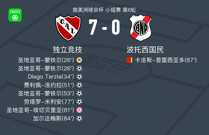 独立竞技7-0血洗波托西国民,圣地亚哥-蒙铁尔梅开二度,加尔达梅斯破门