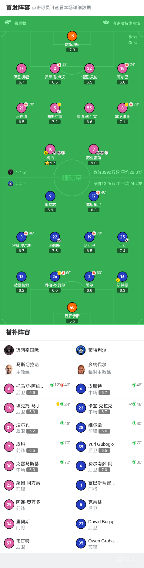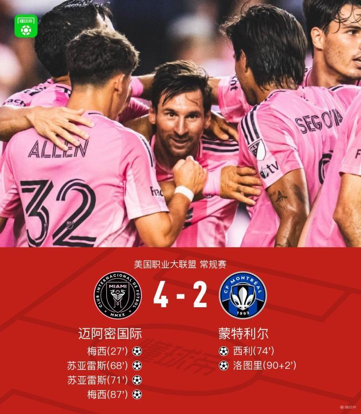 迈阿密国际4-2蒙特利尔,梅西、苏牙相互传射,双双梅开二度