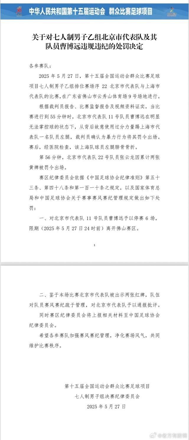 据上观新闻报道,在5月27日进行的全运会群众比赛七人制足球男子乙组的比赛里,北京队前锋曹博远暴力犯规,导致上海队队员左腿腓骨骨折。事后,全运会七人制男子组决赛纪律委员会严厉打击球场暴力,对曹博远做出停赛6场、当天离开佛山赛区的严厉处罚。