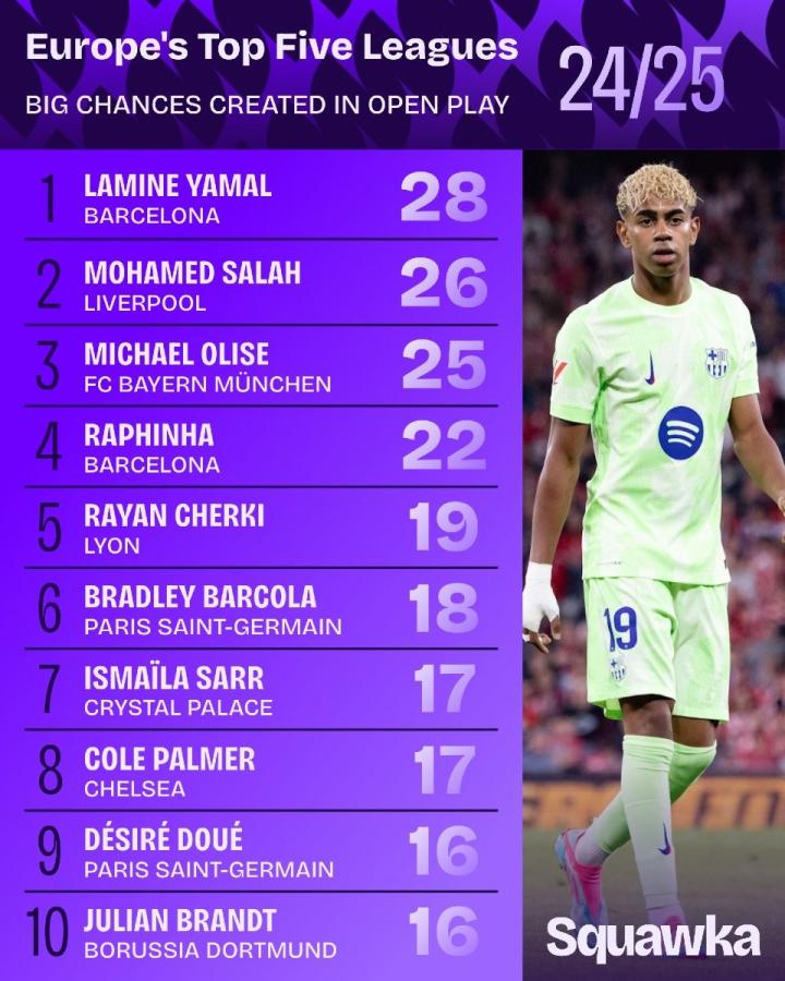 本赛季五大联赛重大机会创造榜前十:亚马尔居首,萨拉赫第二