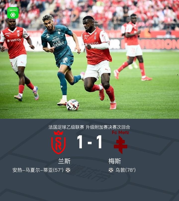 北京时间5月30日,法国足球乙级联赛升级附加赛决赛次回合,兰斯主场迎战梅斯。比赛中,兰斯由安热-马夏尔-蒂亚取得进球,梅斯则由乌敦扳平比分。最终,兰斯1-1战平梅斯,两回合总比分2-2战平。