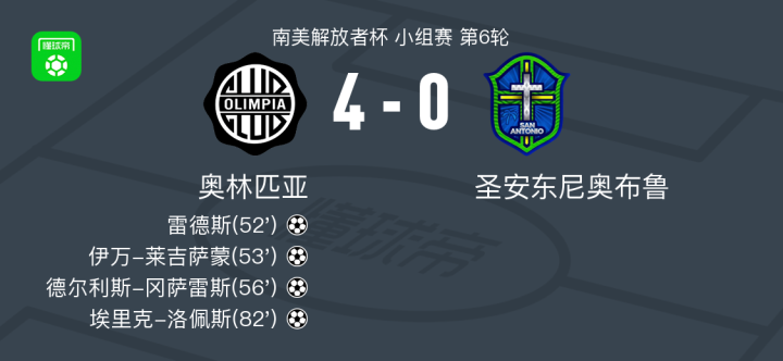 北京时间5月30日南美解放者杯小组赛第6轮,奥林匹亚迎战圣安东尼奥布鲁。比赛中,奥林匹亚展现了强大的进攻实力,雷德斯率先打破僵局,伊万-莱吉萨蒙紧接着再下一城,随后德尔利斯-冈萨雷斯接伊万-莱吉萨蒙的助攻扩大比分,埃里克-洛佩斯在比赛尾声阶段锦上添花。最终,奥林匹亚以4-0战胜圣安东尼奥布鲁。