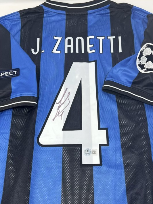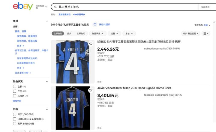 另一件来头更大,是国米队长萨内蒂的亲笔签名球衣,球衣是09-10赛季的,正是国米上一次欧冠夺冠的赛季。在eBay商品界面中可以看到,商家拍摄了多张球衣的照片。球衣上决赛对阵的刺绣非常清晰。萨内蒂的签名也很完美,没有断墨、断笔。签名的防伪标识也贴在球衣上。信息如此详实,买家怎能不放心。这件藏品的价格也很实惠,仅需340美金,合人民币2450元。