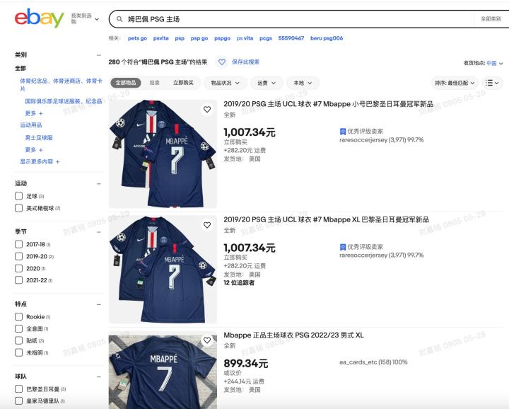 这不,我在eBay上就找到了这两支球队的藏品。其中一件是姆巴佩19-20赛季的欧冠球衣。这件球衣是Nike球员版的fullset球衣,臂章、字号都齐全。eBay上信息显示,这件球衣全新带吊牌,尺码S,有官方许可标识,因此正品无疑。价格上,这件球衣售价140美元,合人民币约1000块钱,对于这样一件稀有且有纪念意义的球衣来说,非常值得。要知道那个赛季,姆巴佩第一次踢上了欧冠决赛!