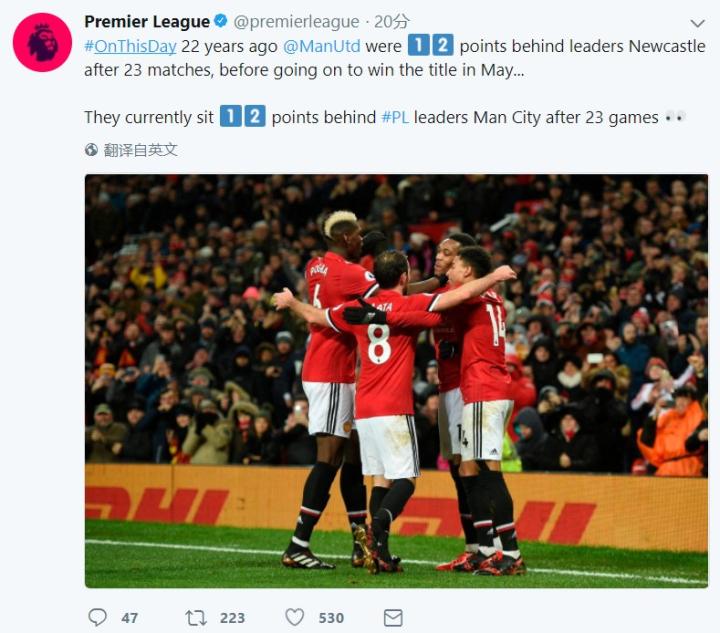 英超官方推特发布了一条推文,回顾了22年前曼联逆转12分分差夺得英超冠军的故事。