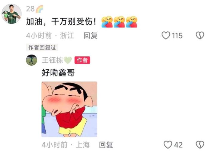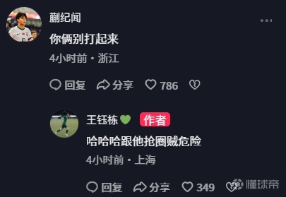不久后蒯纪闻评论:“你俩(王钰栋和刘诚宇)别打起来。”王钰栋回复:“哈哈哈跟他抢圈贼危险。”
