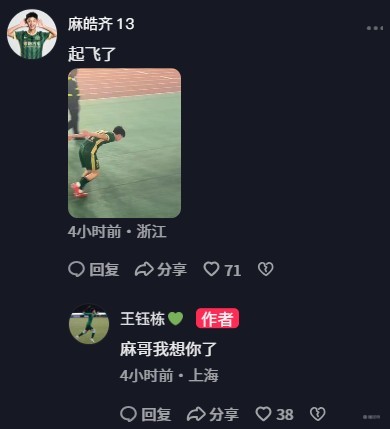 随后王钰栋还和队友岳鑫、麻皓齐等人互动。
