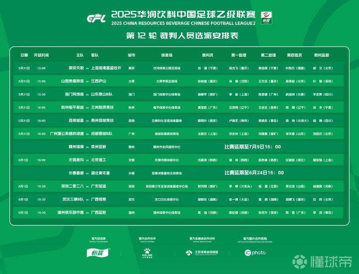 北京时间5月31日,中乙第12轮裁判名单公布,杨春宇执法南通海门珂缔缘vs山东泰山B队。